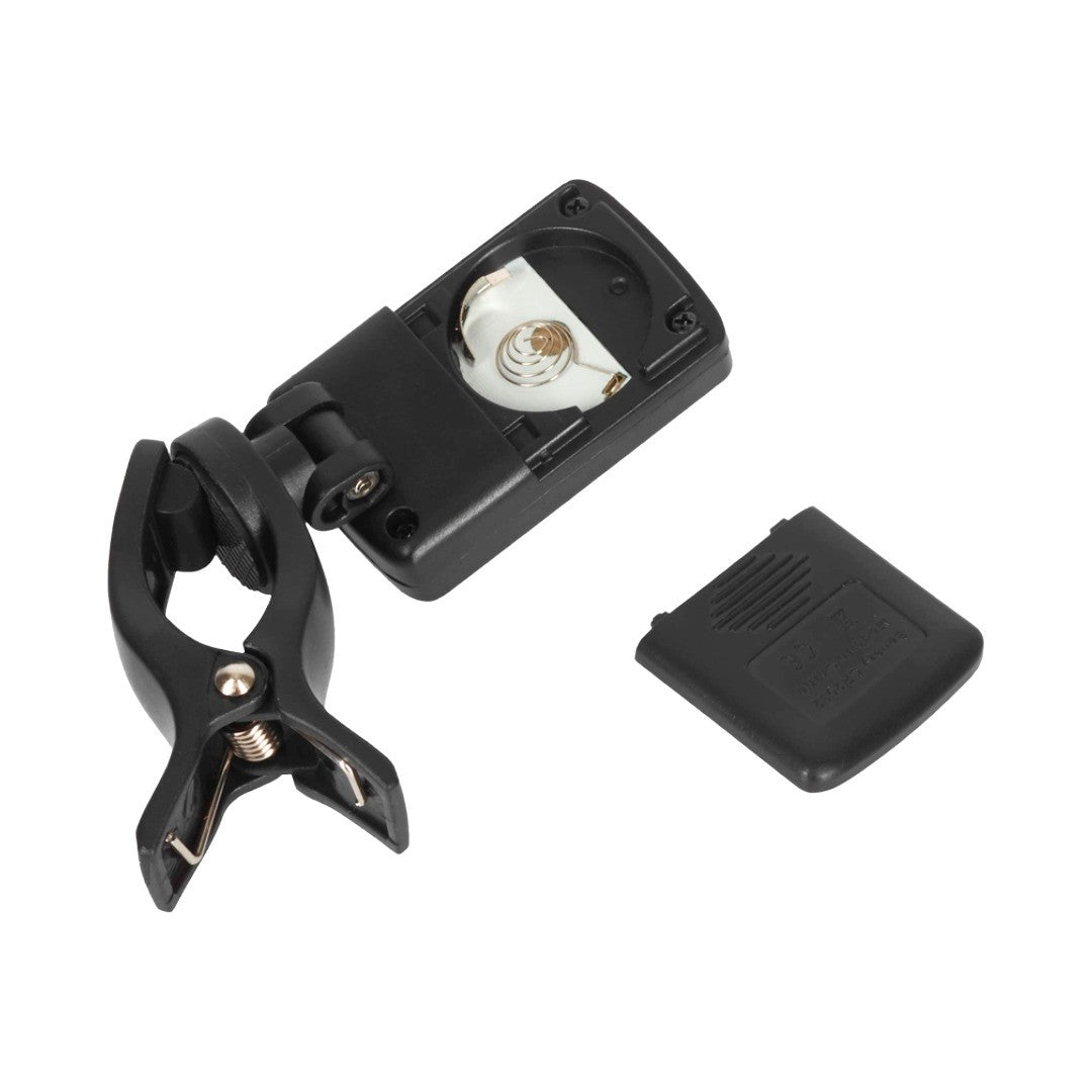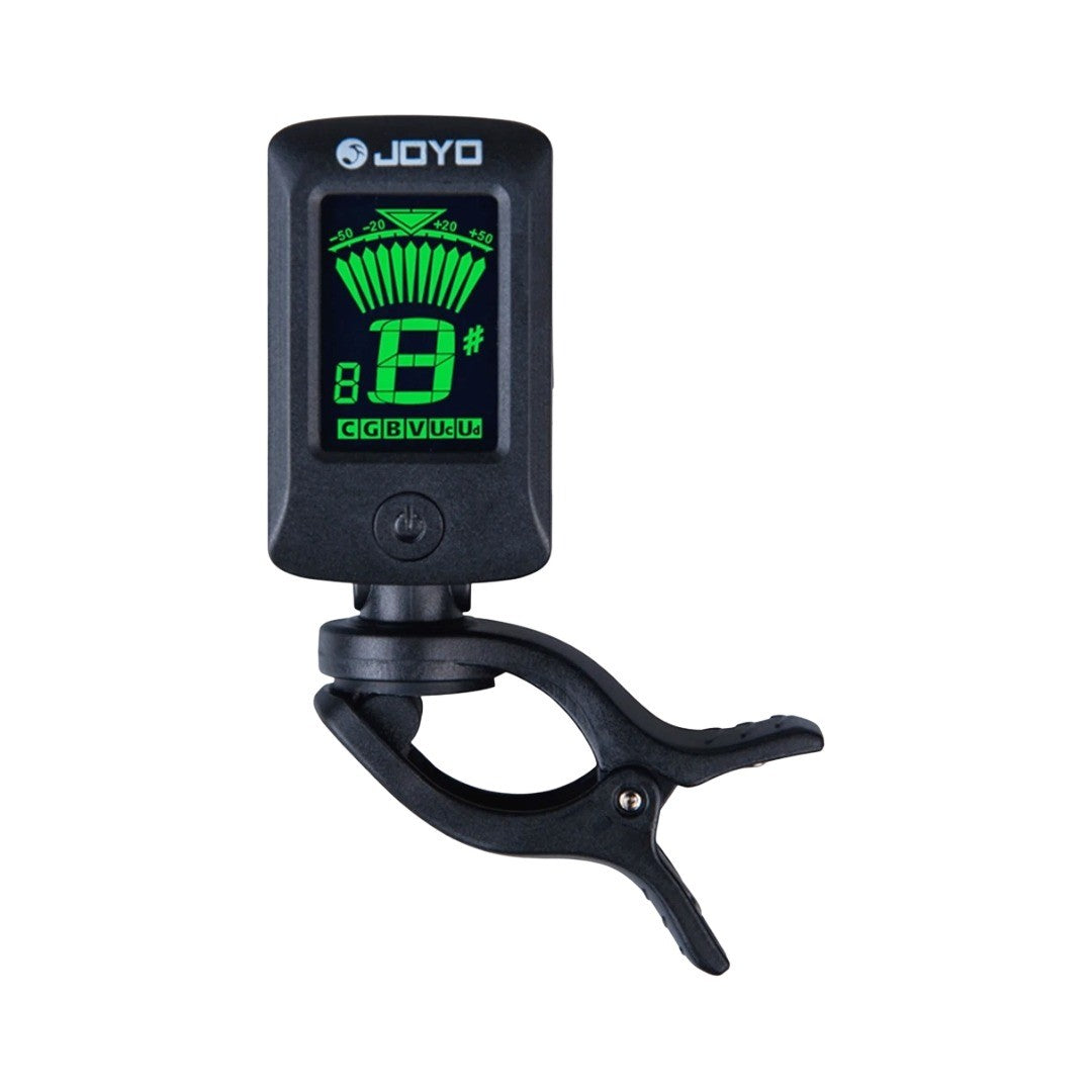 Afinador de clip para instrumentos de cuerda marca Joyo, pantalla lcd, gira 360 grados, usa batería de 3V CR2032 (incluida), material plástico, color negro.