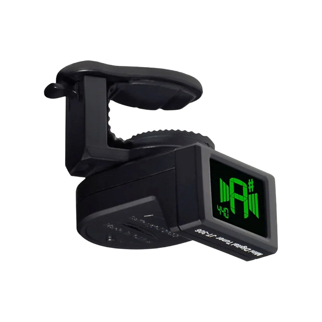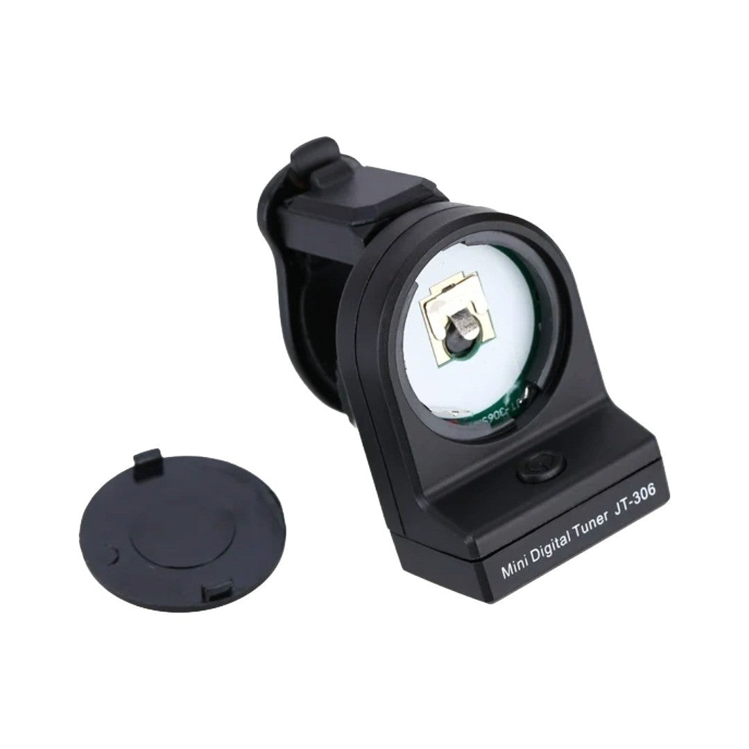 Afinador mini de clip para instrumentos de cuerda marca Joyo, pantalla lcd, gira 360 grados, usa batería de 3V CR2032 (incluida), material plástico, color negro.