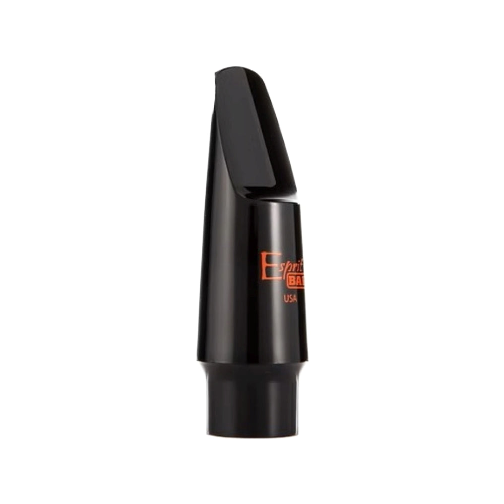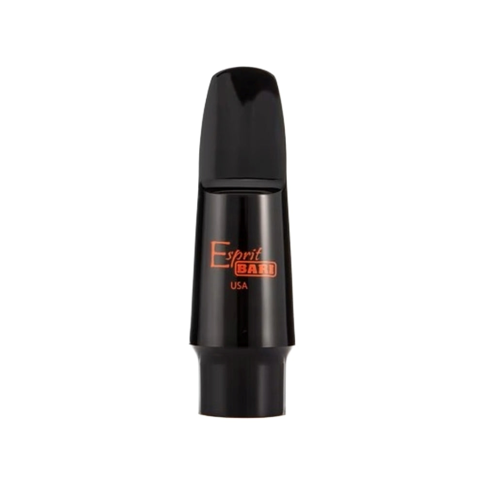 Boquilla para saxofón alto marca Bari serie Esprit, cámara cuadrada, material plástico ebonita, acabado pulido y brillante, incluye abrazadera normal de metal niquelado y tapa boquilla plástica.