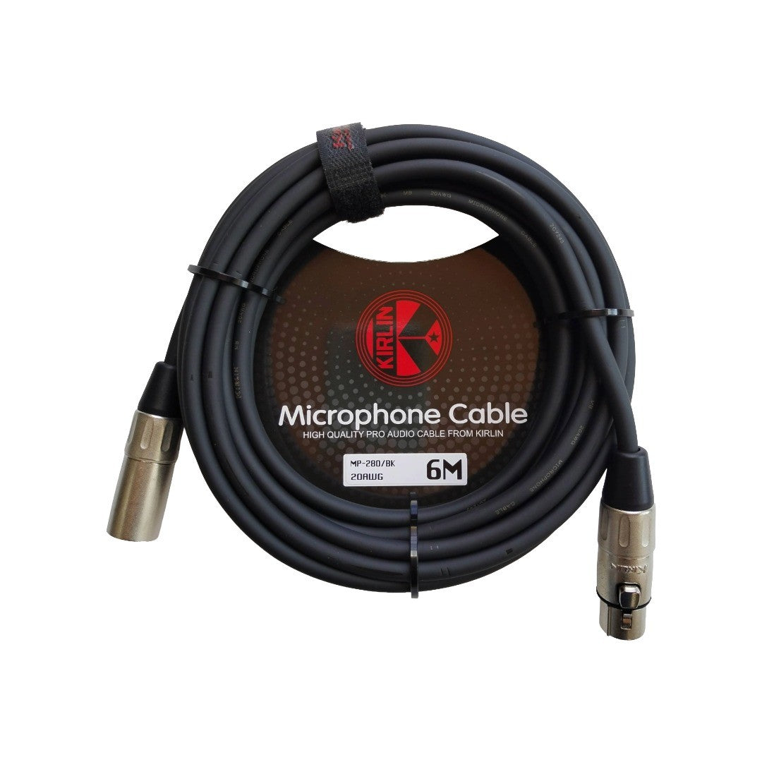 Cable para micrófono marca Kirlin, conectores XLR macho a XLR hembra, estañados, 3 pines, cable de cobre, calibre 20, revestimiento pvc, largo de 6 mt, color negro.