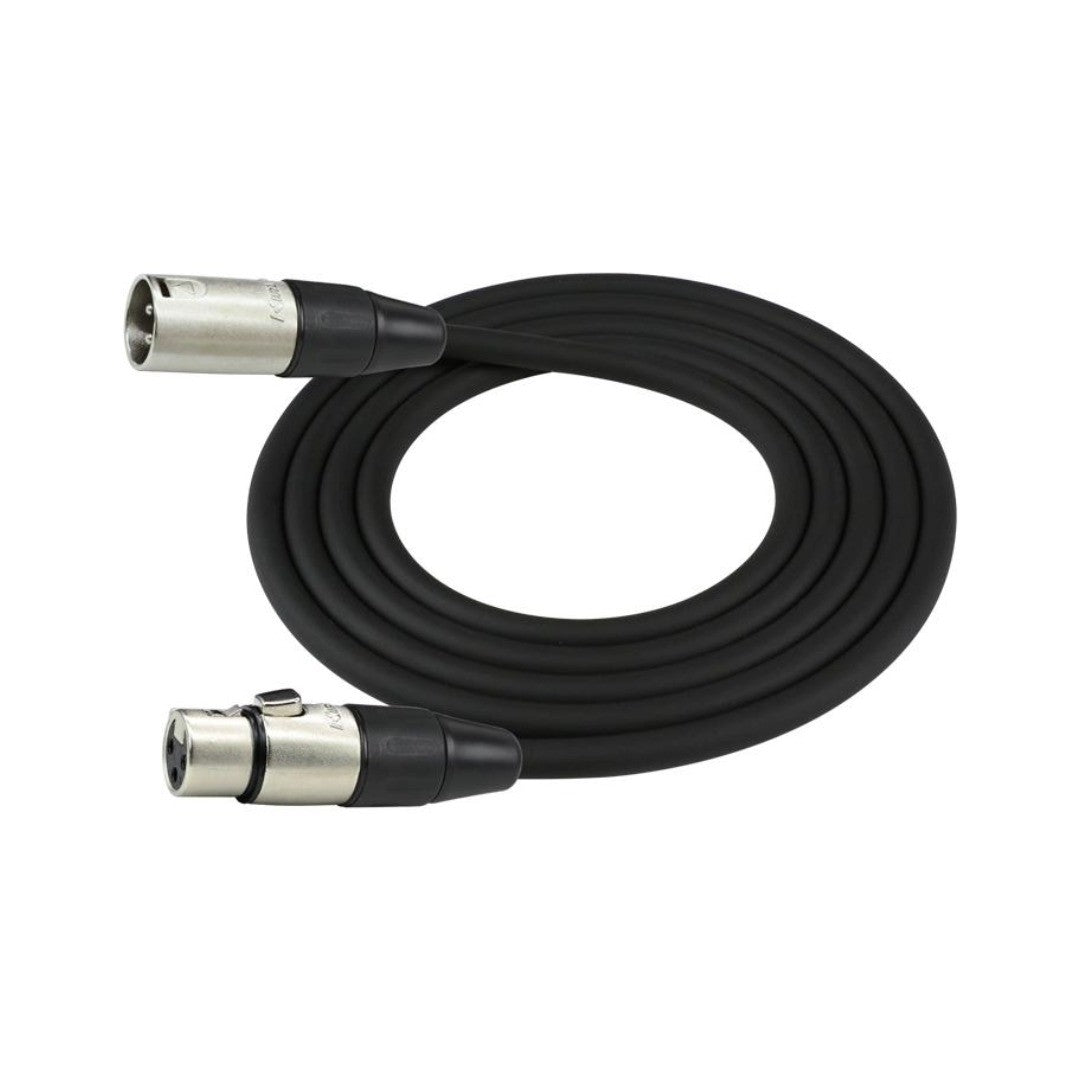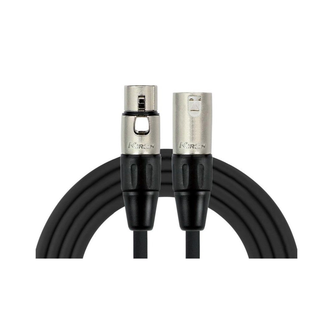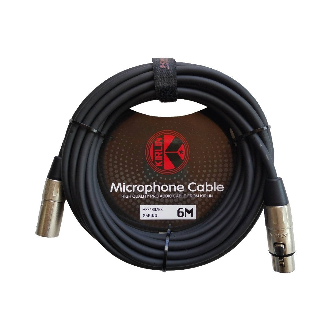 Cable para micrófono marca Kirlin, conectores XLR macho a XLR hembra, estañados, 3 pines, cable de aleación de cobre, calibre 24, revestimiento pvc, largo de 6 mt, color negro.