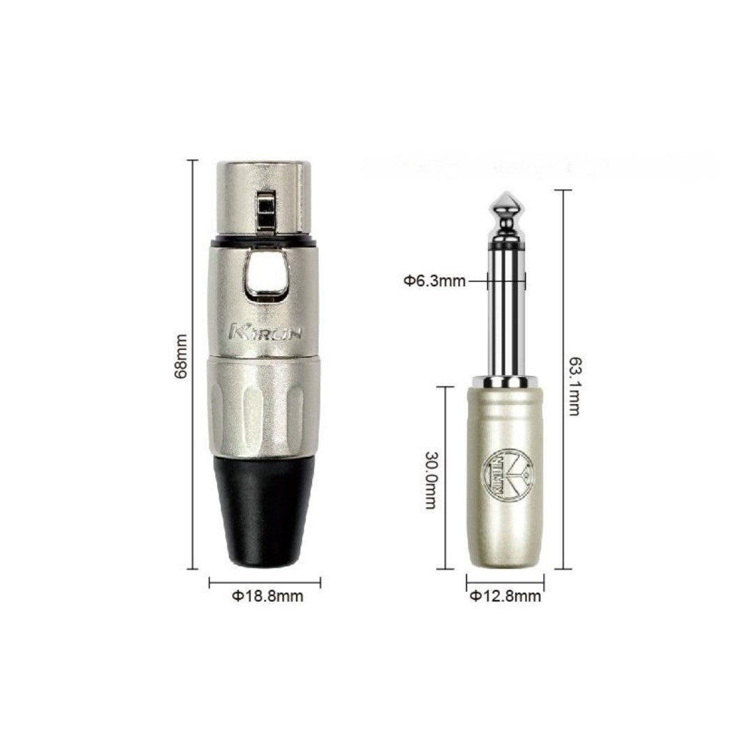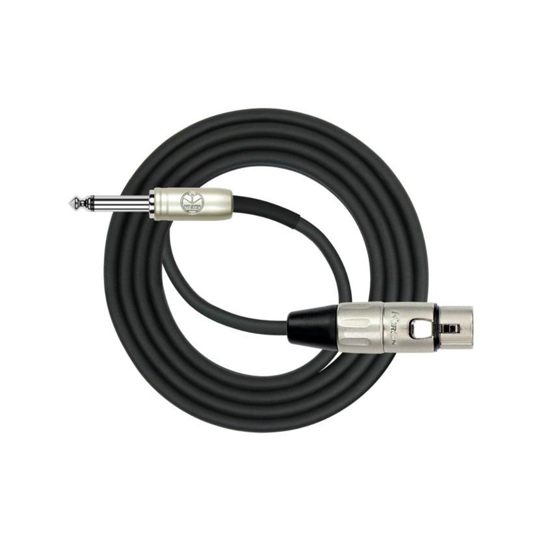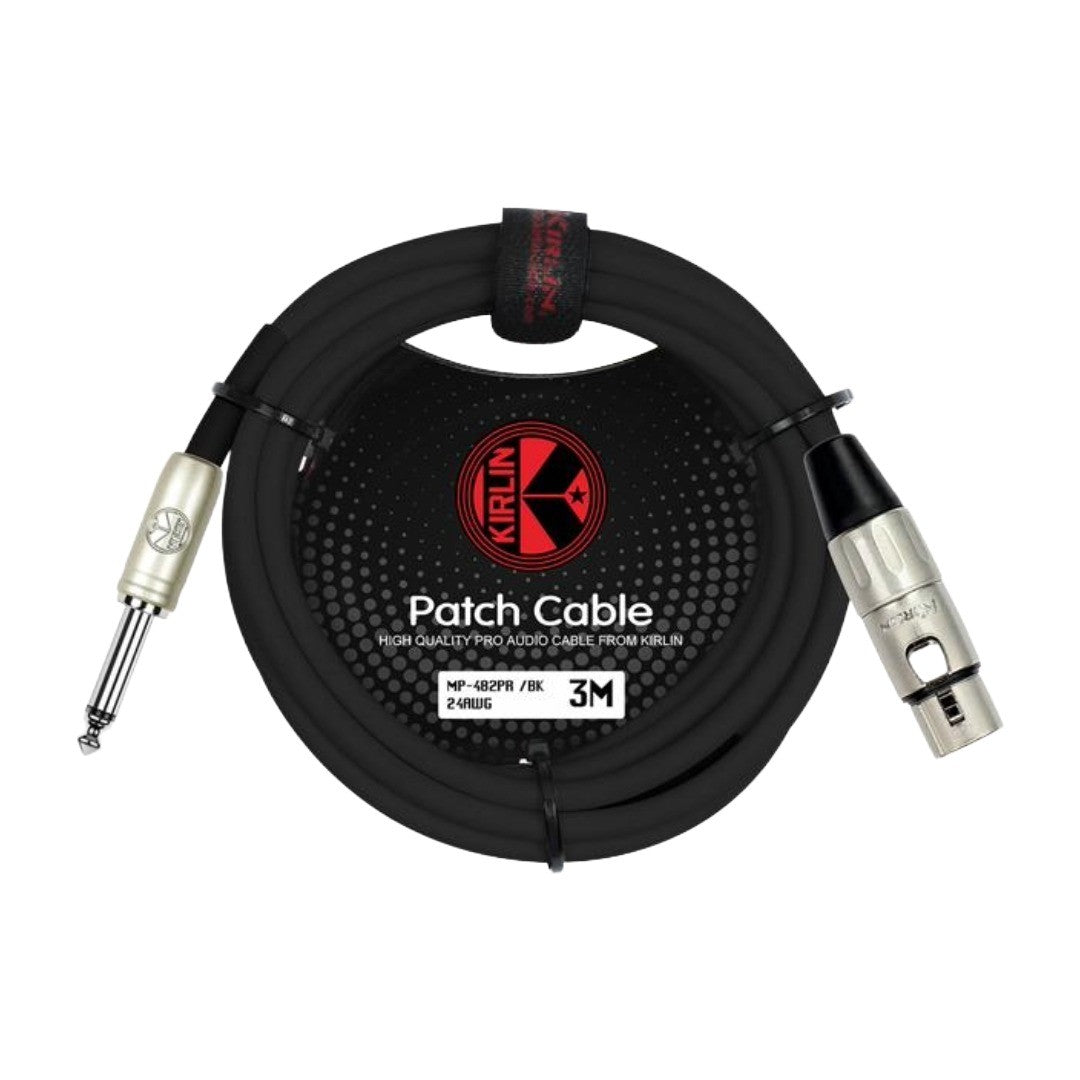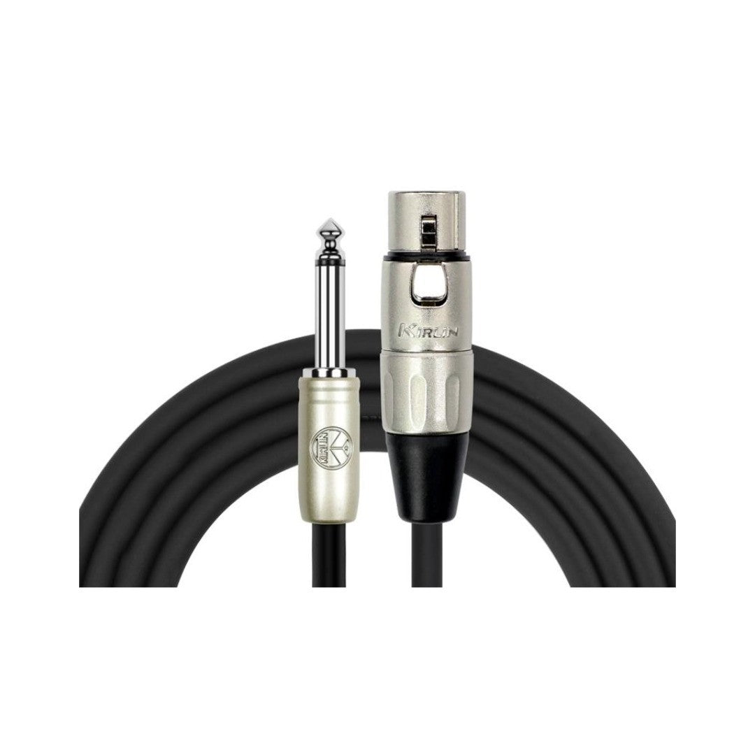 Cable para señal marca Kirlin, conector XLR hembra, estañado, 3 pines, a conector 1/4, recto, niquelado, mono, cable de cobre, calibre 24, largo de 3 mt, color negro.