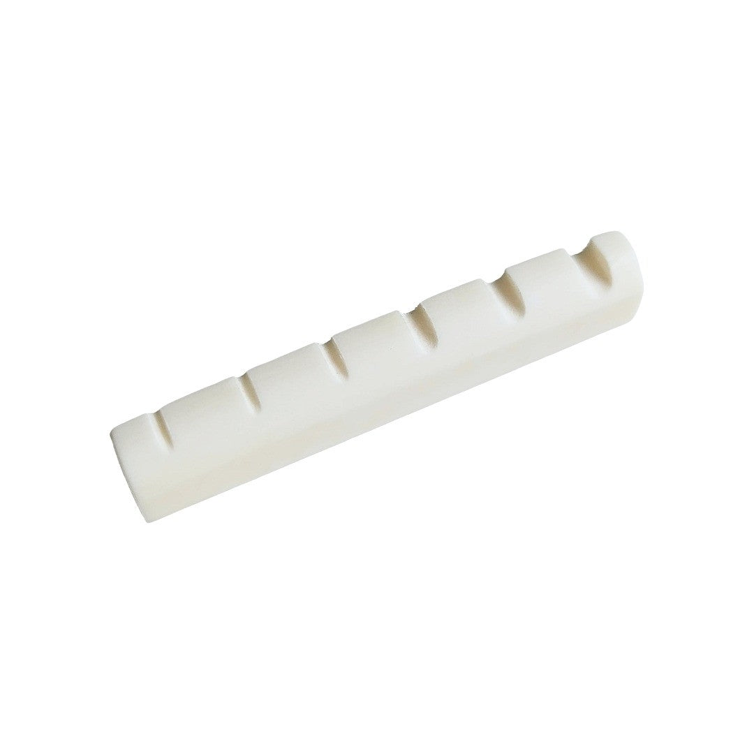 Cejilla superior para bajo eléctrico de 6 cuerdas marca Memphis, material hueso, largo de 53 mm, color blanco.