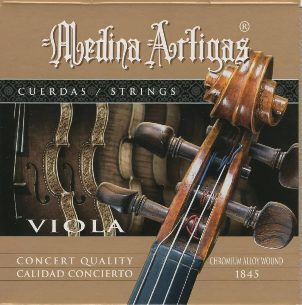 Juego de cuerdas para viola marca Medina Artigas, cuerda 1ra y 2da de acero con entorchado cromo, cuerda 3ra y 4ta de nylon con entorchado cromo.