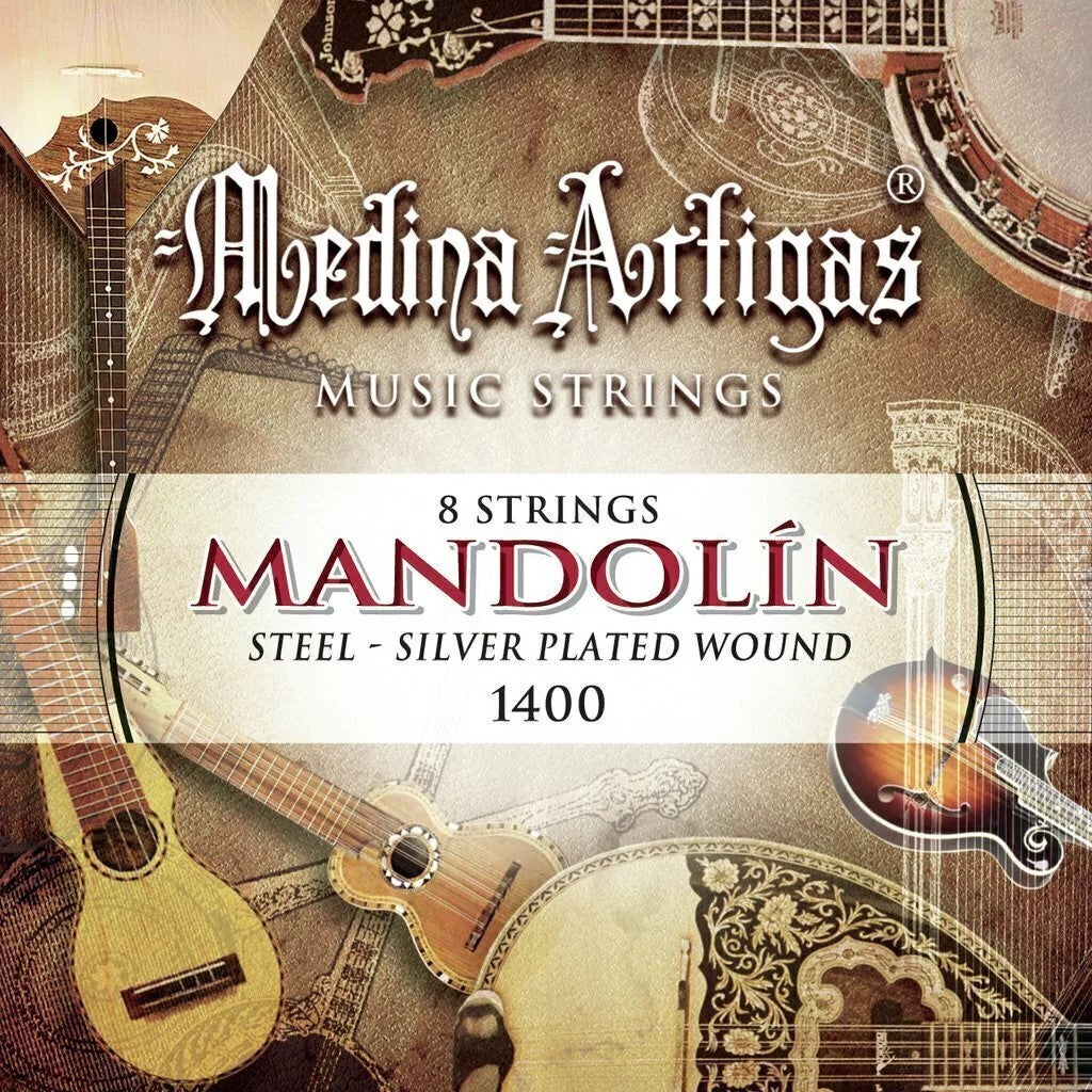 Juego de cuerdas para mandolina marca Medina Artigas, cuerda de acero, entorchado plateado.