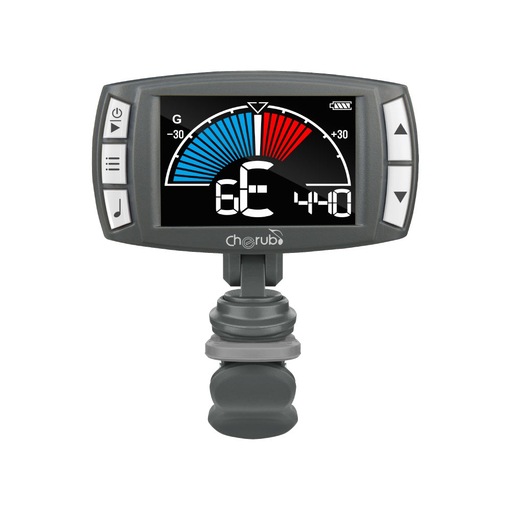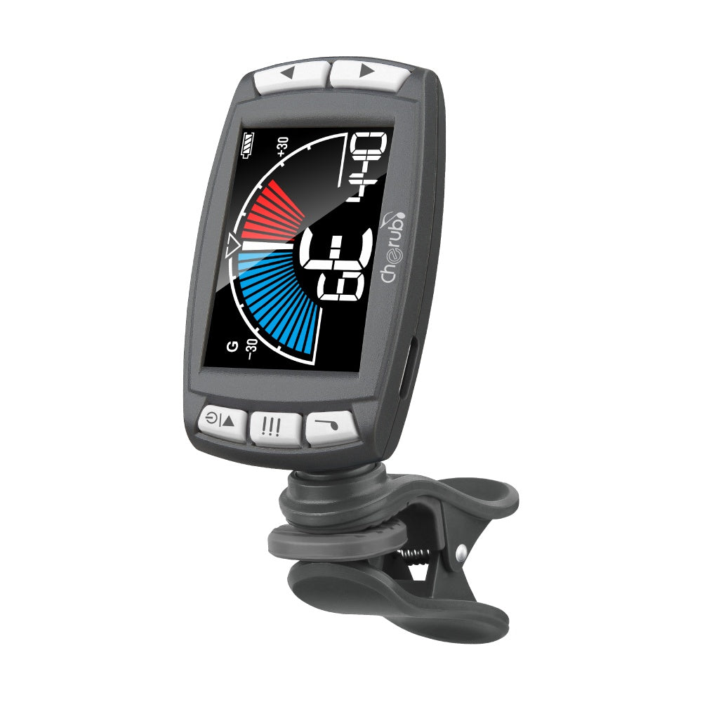 Metrónomo, afinador y generador de tonos de clip para instrumentos de cuerda marca Cherub, pantalla lcd a color, batería recargable (incluye cable USB-C), material plástico, color negro.