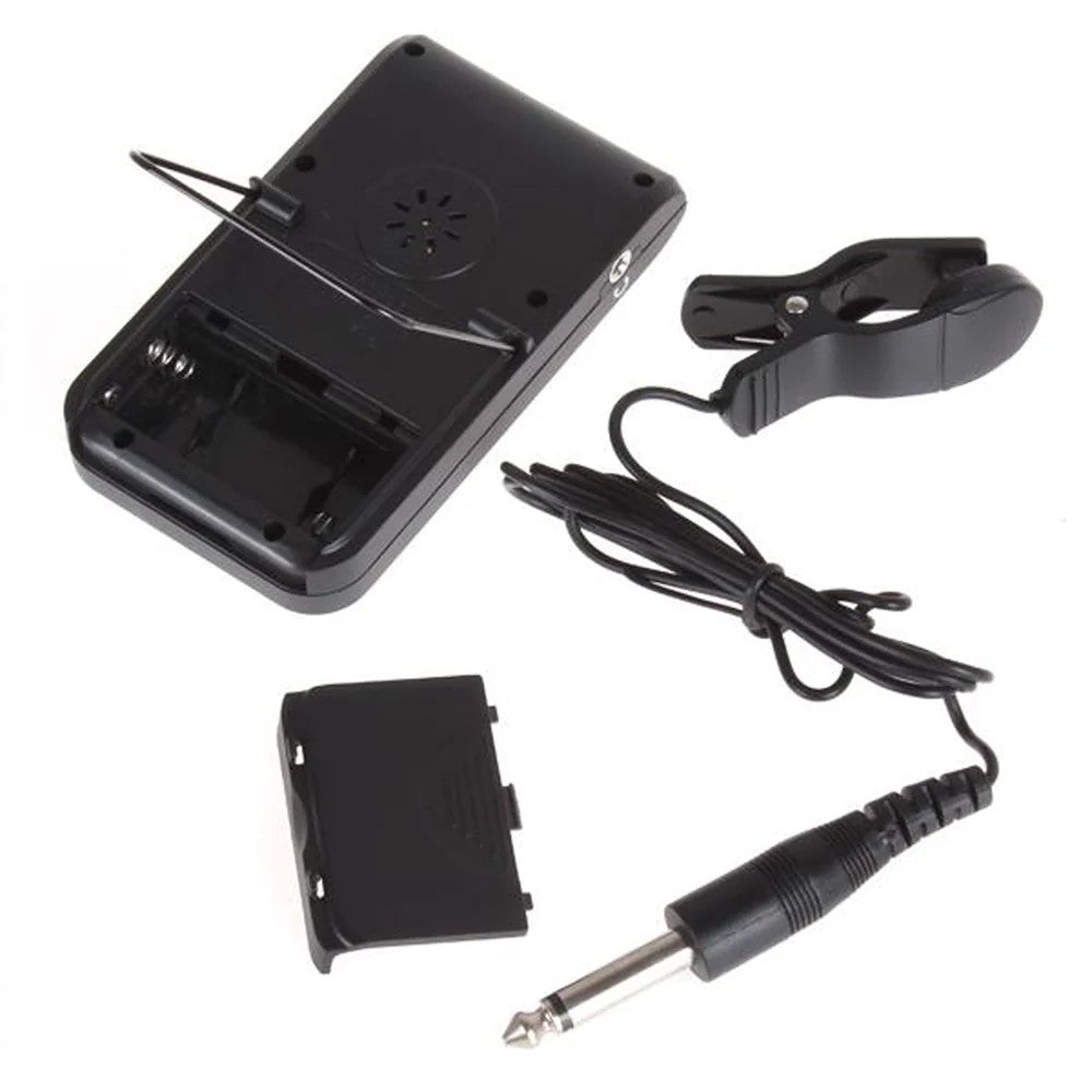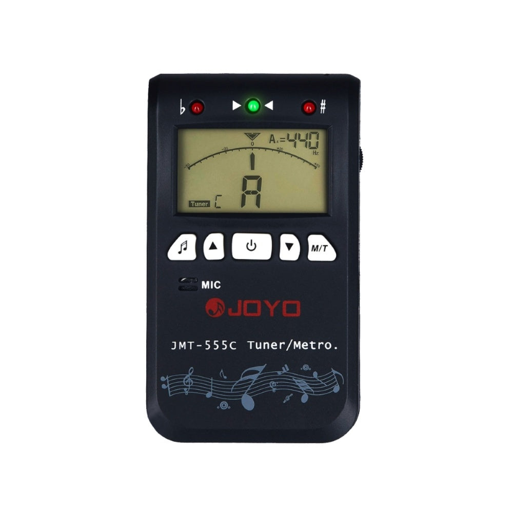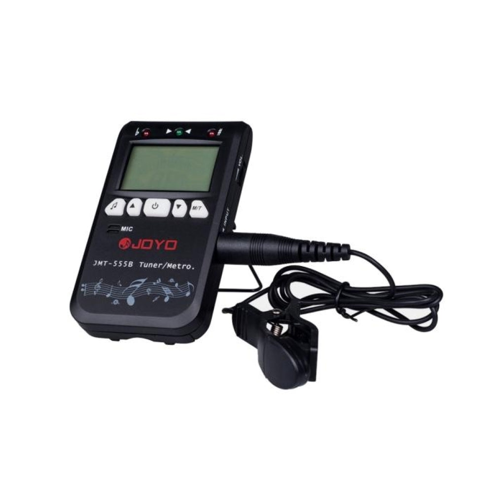 Metrónomo, afinador y generador de tonos para instrumentos de cuerda marca Joyo, pantalla lcd, usa baterías AAA (incluidas), incluye micrófono piezoeléctrico con clip, entrada de audífonos, entrada de 1/4, material plástico, color negro.