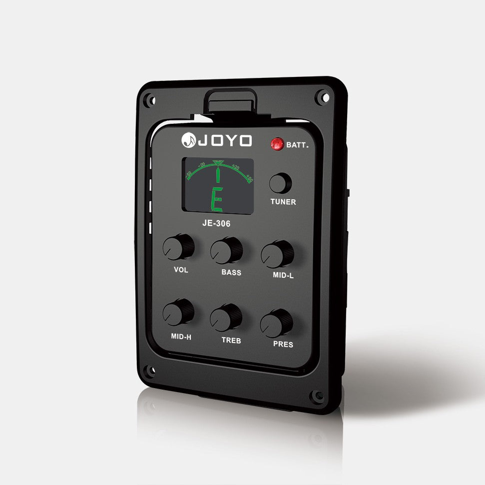 Micrófono preamplificador activo de 5 bandas para guitarra marca Joyo, pantalla led, largo de 85 mm, ancho de 57 mm, material plástico, color negro.