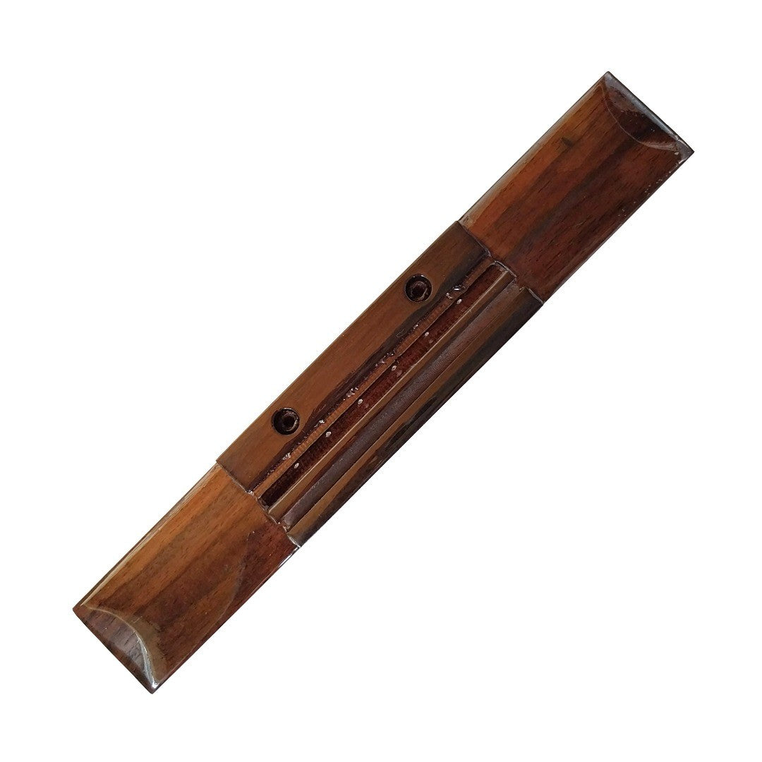 Puente para guitarra clásica y requinto, largo de 18.5 cm, ancho de 3 cm, tiene perforaciones para cuerdas, material de madera ébano, acabado laqueado.
