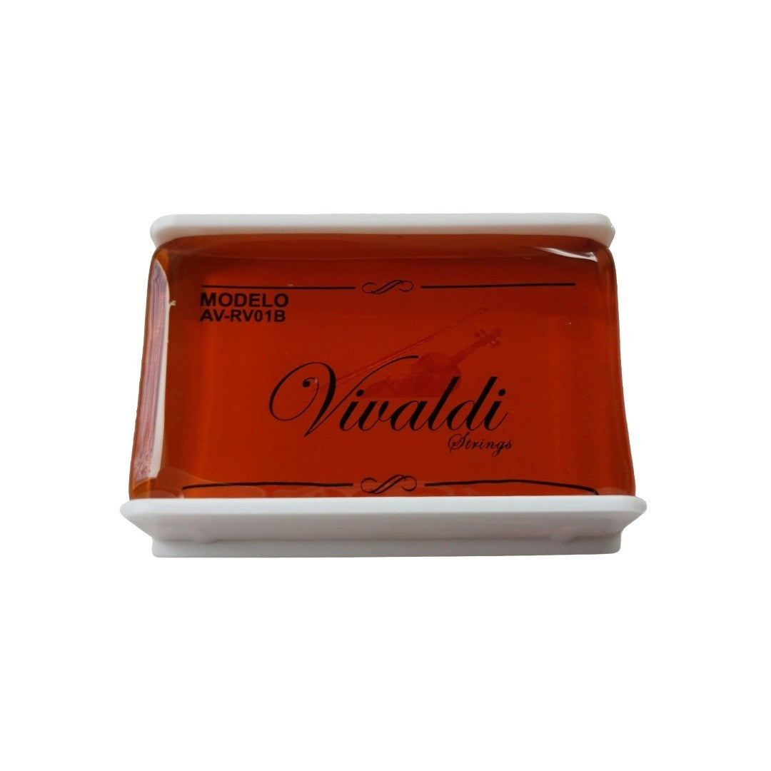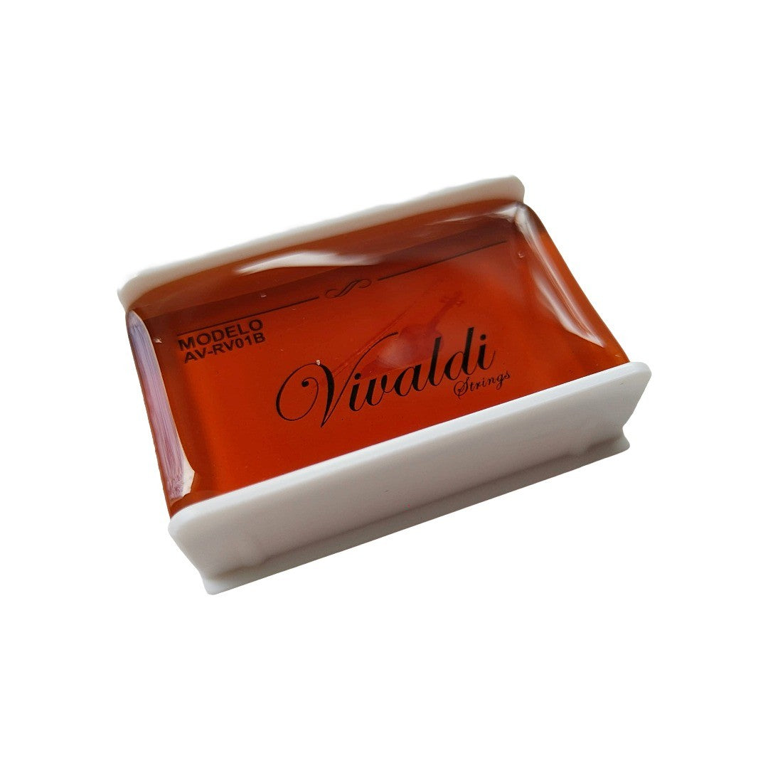 Resina para instrumento de cuerda frotada marca Vivaldi, presentación pastilla rectangular con agarre plástico lateral, color ámbar.